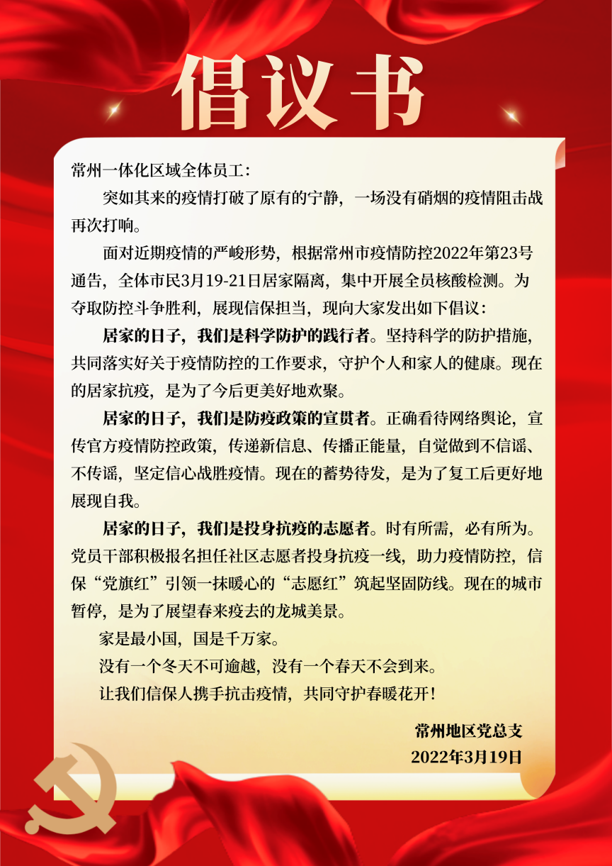 常州一體化區(qū)域領(lǐng)導(dǎo)班子召開(kāi)專題會(huì)議,要求全體黨員干部把做好疫情防控工作作為當(dāng)前重要政治任務(wù),強(qiáng)化責(zé)任意識(shí),層層壓實(shí)責(zé)任,盯住關(guān)鍵環(huán)節(jié),有力有序落實(shí)落細(xì)各項(xiàng)防控措施,提升應(yīng)對(duì)能力,落實(shí)物資保障,切實(shí)做到守土有責(zé)、為民負(fù)責(zé)、履職盡責(zé)。同時(shí),常州地區(qū)黨總支發(fā)布倡議書(shū),號(hào)召全體員工居家隔離期間爭(zhēng)當(dāng)科學(xué)防護(hù)的踐行者、防疫政策的宣貫者、投身抗疫的志愿者,齊心協(xié)力守護(hù)好人民群眾生命安全和身體健康。