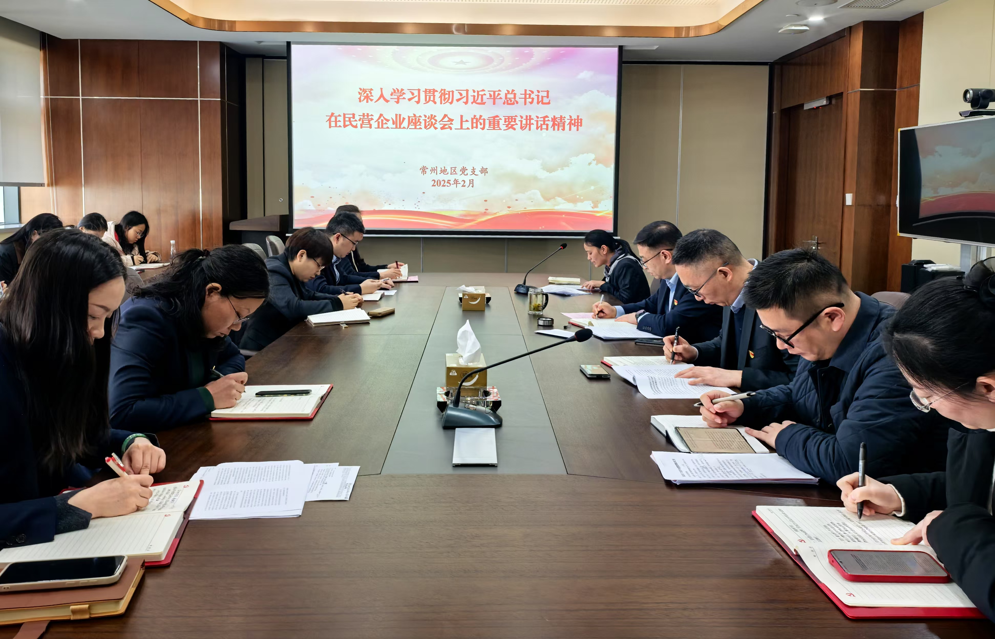 2月26日,常州地區(qū)黨支部開展月度集中理論學習,傳達學習習近平總書記在民營企業(yè)座談會上的重要講話精神。