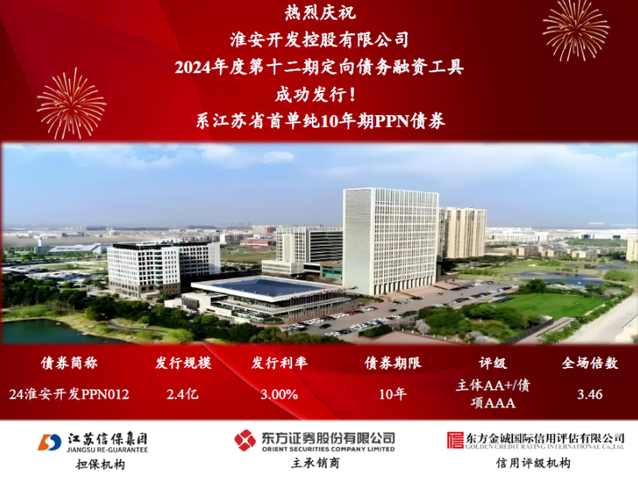 12月24日,淮安開發(fā)控股有限公司2024年度第十二期定向債務(wù)融資工具成功發(fā)行。本期債券由江蘇信保集團(tuán)提供全額增信,發(fā)行規(guī)模2.4億元,發(fā)行期限10年,全場(chǎng)認(rèn)購(gòu)倍數(shù)3.46倍,票面利率3%,系江蘇省首單純10年P(guān)PN債券。