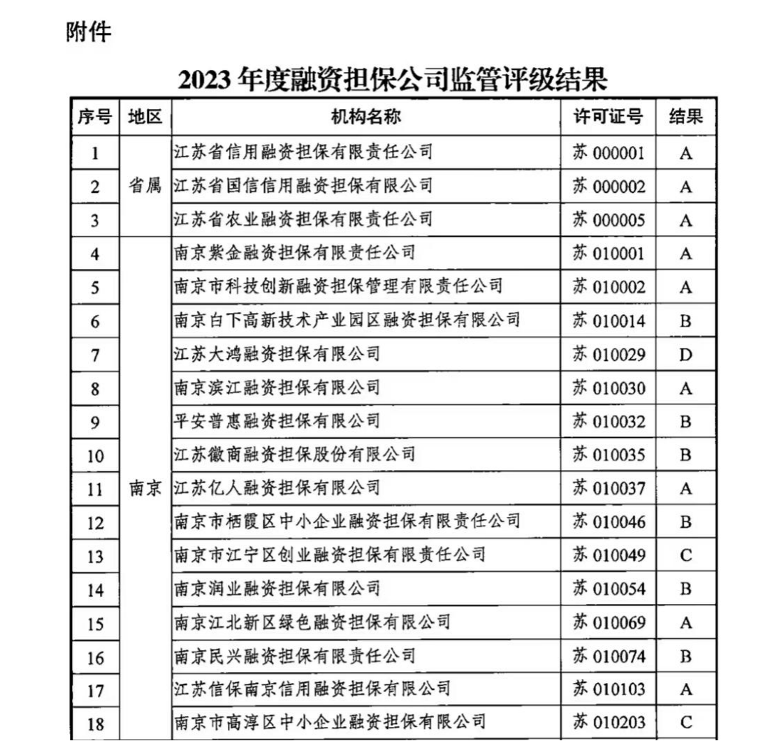 近日,江蘇省地方金融管理局公布了全省融資擔(dān)保機(jī)構(gòu)監(jiān)管評級結(jié)果,南京擔(dān)保連續(xù)第2年獲最高評級A級,持續(xù)助力地方民營經(jīng)濟(jì)發(fā)展,積極發(fā)揮政府性融資擔(dān)保機(jī)構(gòu)引導(dǎo)作用。下一步,南京擔(dān)保會繼續(xù)立足支小支農(nóng),積極推動“小微貸”“寧創(chuàng)貸”等政銀擔(dān)普惠產(chǎn)品,在助推實體經(jīng)濟(jì)高質(zhì)量發(fā)展中展現(xiàn)擔(dān)保擔(dān)當(dāng)。(南京一體化區(qū)域 倪緯緯)