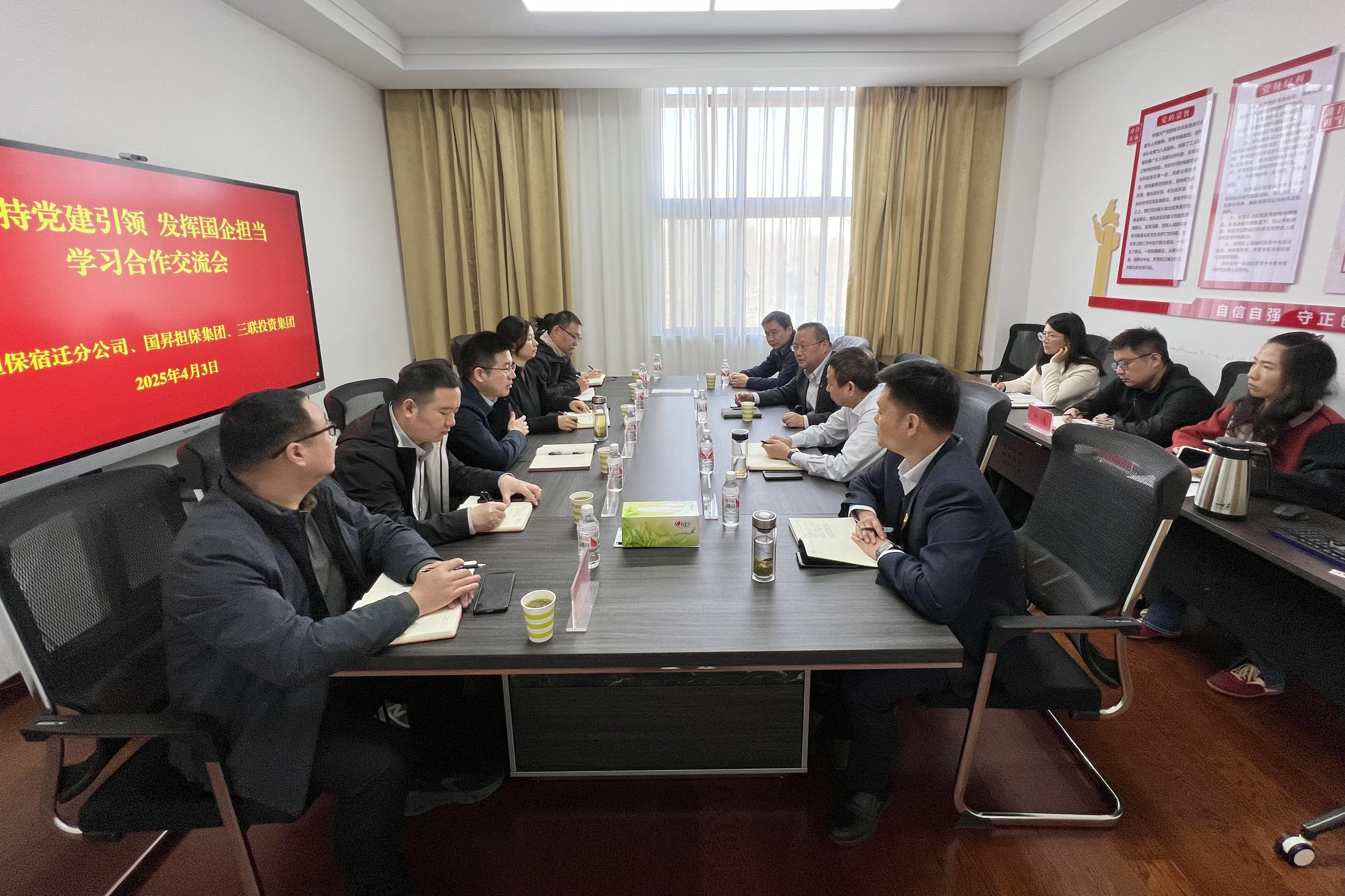 4月3日,宿遷分公司攜手同創(chuàng)擔(dān)保、三聯(lián)擔(dān)保,開(kāi)展“堅(jiān)持黨建引領(lǐng),發(fā)揮國(guó)企擔(dān)當(dāng)”交流座談。會(huì)上,三方成功簽署了黨建聯(lián)盟協(xié)議,旨在通過(guò)黨建引領(lǐng)推動(dòng)業(yè)務(wù)創(chuàng)新和風(fēng)險(xiǎn)管控,為服務(wù)地方實(shí)體經(jīng)濟(jì)和支小支農(nóng)注入新動(dòng)力。