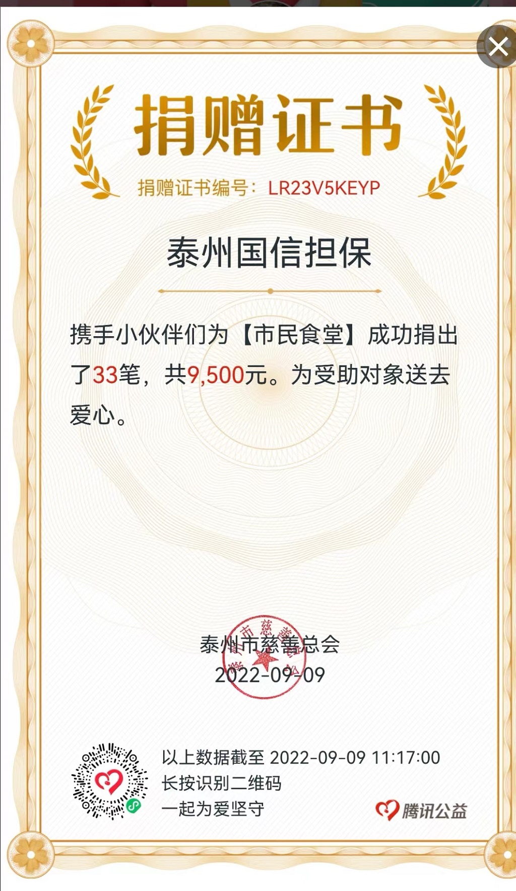 一年一度的中華慈善日來臨之際,在得知姜堰區(qū)正在打造老年人助餐中心,姜堰金融局在金融系統(tǒng)發(fā)起“我們?yōu)槭忻袷程没I集善款”活動的消息后,泰州國信擔保積極響應,開展“慈善一日捐”活動,廣大黨員帶頭,干部員工積極踴躍捐款,共計捐款10200元(其中通過騰訊公益單位組隊形式捐款9500元,個人渠道捐款700元),助力姜堰區(qū)老年人助餐中心建設。
