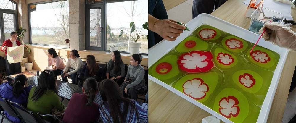 在非遺體驗(yàn)活動(dòng)現(xiàn)場,大家根據(jù)自己的喜好,將染料滴入水中,或輕輕撥動(dòng)水面,或精準(zhǔn)滴落,層層疊疊的顏色在水面上緩緩鋪展,相互交織,相互融合,最終,這些圖案被巧妙地轉(zhuǎn)移到絲巾上,每條絲巾都成為了獨(dú)一無二的“手工限量版”。