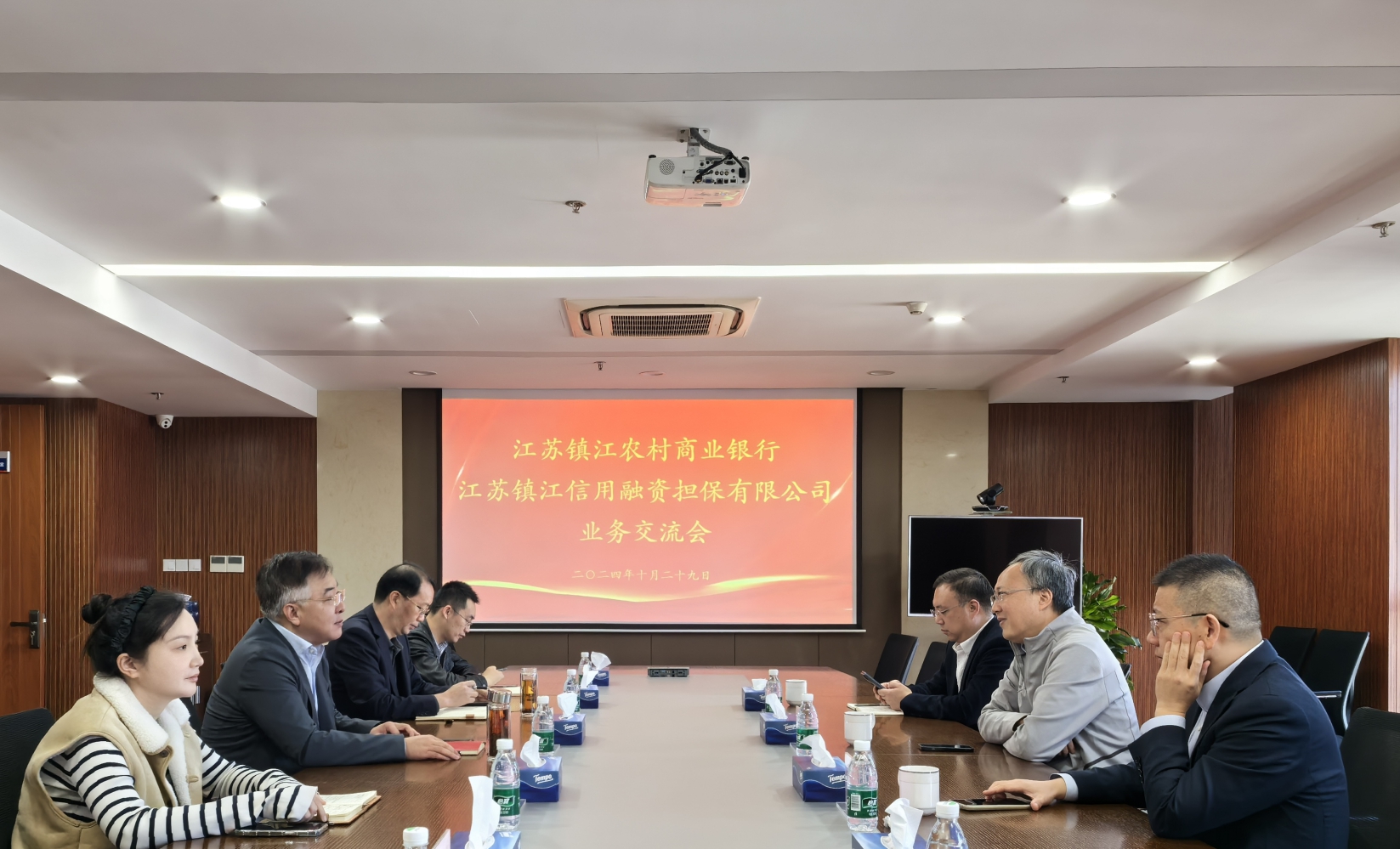 10月29日,鎮(zhèn)江農(nóng)商行行長(zhǎng)戴新銘一行到鎮(zhèn)江擔(dān)保與鎮(zhèn)江擔(dān)??偨?jīng)理及相關(guān)部門負(fù)責(zé)人就業(yè)務(wù)合作、產(chǎn)品開(kāi)發(fā)、銀行授信等內(nèi)容開(kāi)展深入交流。