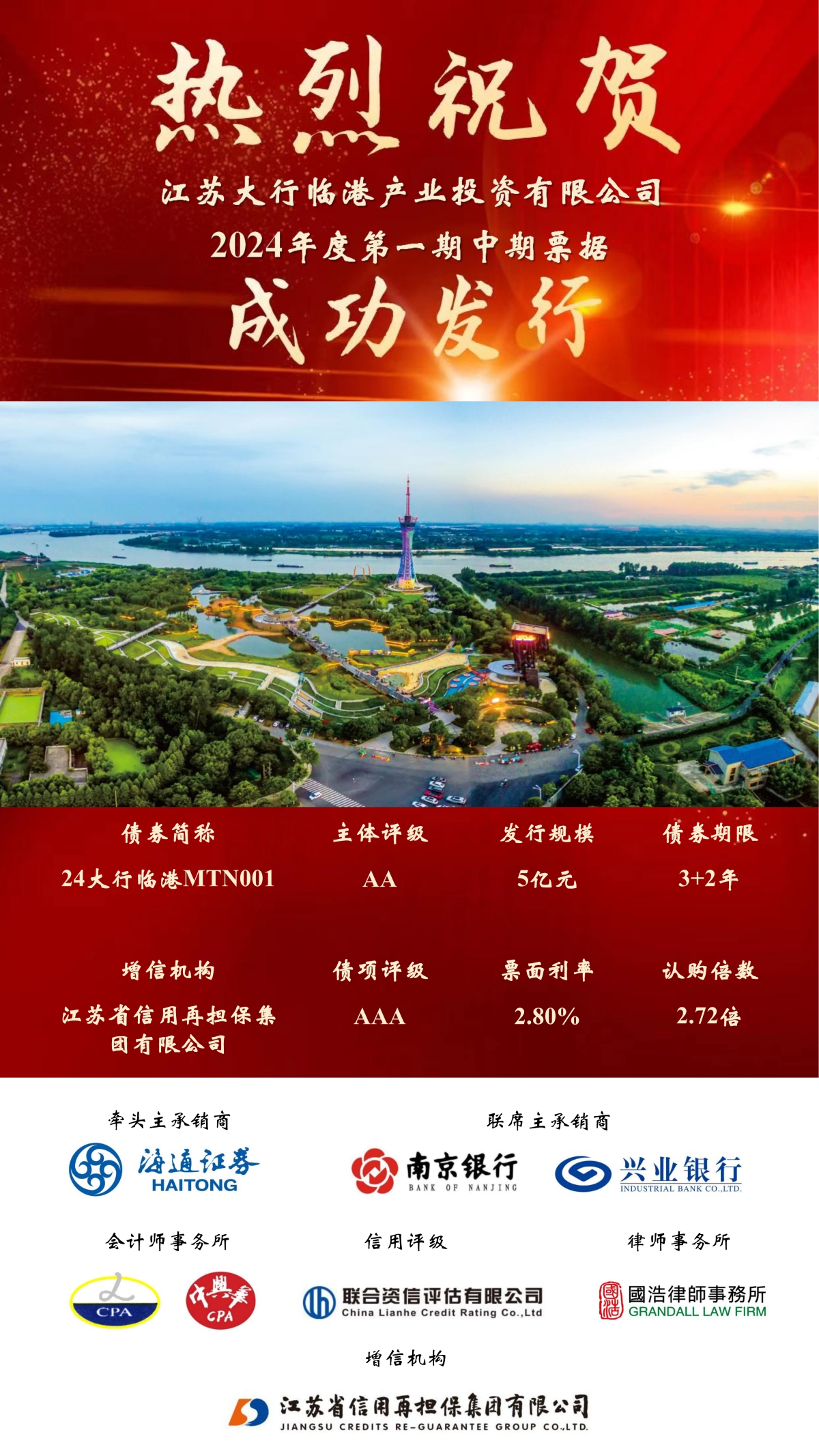 2024年10月30日,由集團(tuán)增信的江蘇大行臨港產(chǎn)業(yè)投資公司2024年度第一期中期票據(jù)(“24大行臨港MTN001”)成功發(fā)行。本次中期票據(jù)由海通證券主承,發(fā)行規(guī)模5億元,期限3+2年,票面利率2.8%,全場(chǎng)認(rèn)購(gòu)倍數(shù)2.72倍,比本次置換的中票綜合融資成本降低了130BP,在當(dāng)前債務(wù)監(jiān)管的力度不斷提升,融資政策趨于嚴(yán)格的背景下,切實(shí)為發(fā)行人大幅降低了發(fā)行成本、調(diào)整了資債結(jié)構(gòu),充分體現(xiàn)出資本市場(chǎng)對(duì)集團(tuán)增信的認(rèn)可。